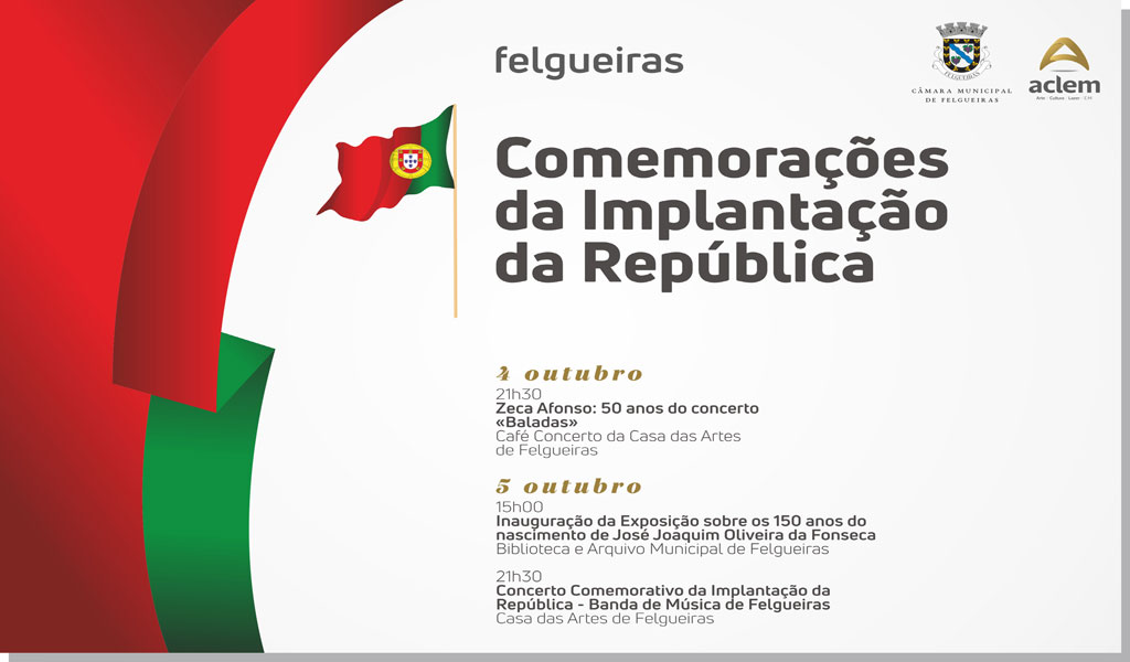 As comemorações encerram com chave de ouro. Ainda no dia 05 de outubro, às 21h30 a Casa das Artes acolhe o Concerto Comemorativo da Implantação da República, interpretado pela Banda de Música de Felgueiras.