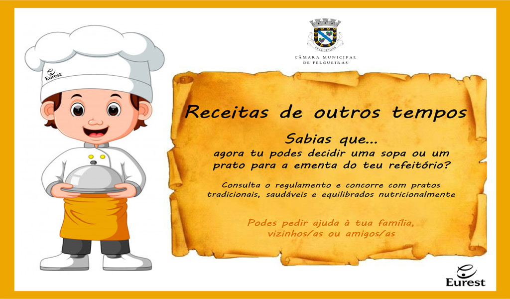 “Receitas de Outros Tempos” é o nome do concurso que o Município de Felgueiras, em parceria com a EUREST, está a promover com o objetivo de fomentar a transmissão de conhecimentos de receitas de gerações anteriores, a partilha intra e interescolar, a gastronomia local, as atividades intergeracionais e de incentivar o envolvimento e o interesse dos alunos nas refeições disponibilizadas no refeitório da escola.